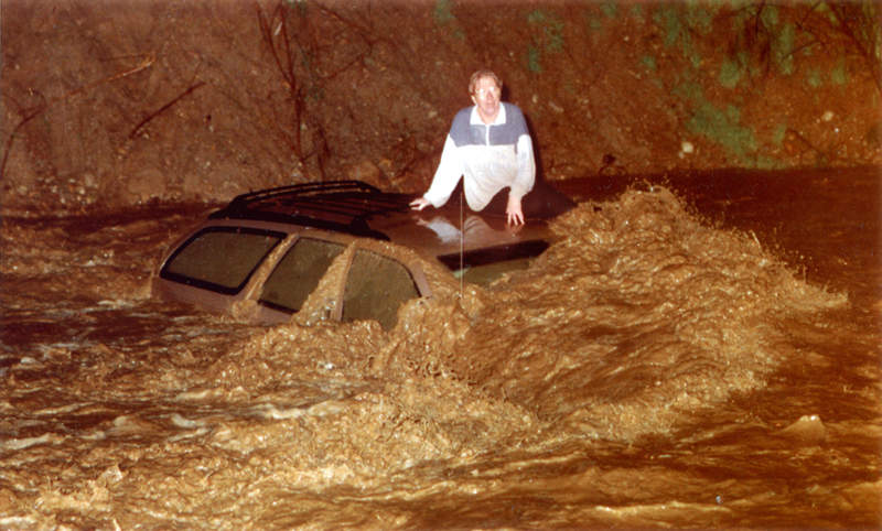 February 1998: A motorist is stranded as Placerita Creek overflows. Photo by Gary Thornhill/SCVHistory.com.