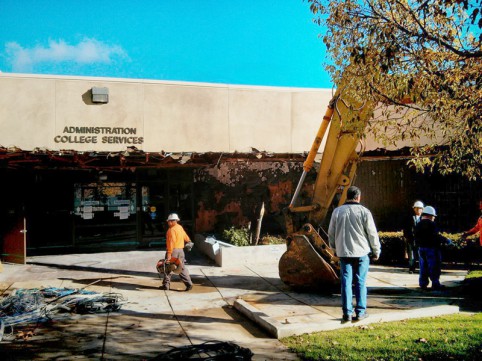 The demolition clears a path for the campus to build a new, two-story, 46,000-square-foot Student Services and Administration building.