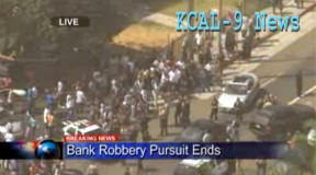 Crowd gathers in South L.A. as Canyon Country bank robbery suspects are apprehended following a chase.