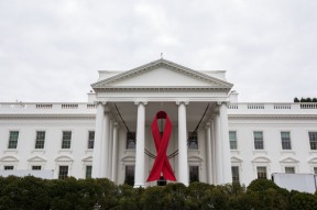 A red ribbon hangs from the North Portico of the White House on Dec. 2, 2013 to mark World AIDS Day | White House Photo by Chuck Kennedy