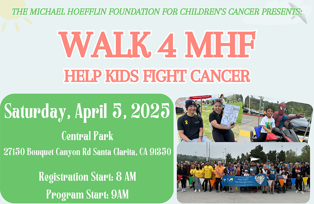 The Michael Hoefflin Foundation for Children’s Cancer invites the community to join the annual “Walk 4 MHF Help Kids Fight Cancer” to help raise awareness and support local families affected by childhood cancer. The family-friendly event is scheduled to begin 9 a.m. Saturday, April 5, at Central Park, 27200 Bouquet Canyon Road, Santa Clarita, CA 91350.