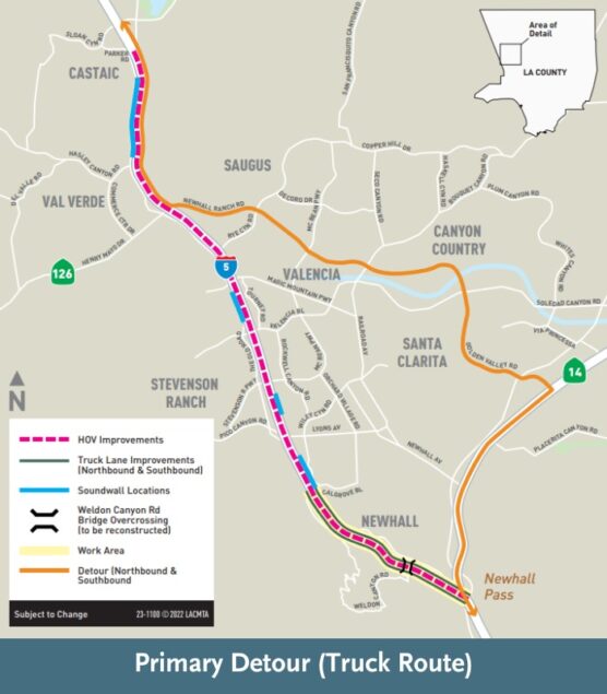 Primary Detour: Traveling southbound on I-5, exit at Newhall Ranch Road; continue east on Newhall Ranch Road/Golden Valley Road to the southbound SR-14/I-5 interchange.