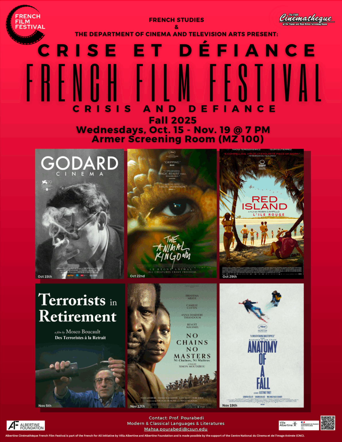 “We are thrilled and delighted to be in partnership with the French Studies Program,” said Dianah Wynter, curator of the Cinematheque. “The selection of films is unique —exceptional films that had not yet found an American audience. The Cinematheque is committed to bringing new cinema experiences to the CSUN community.”