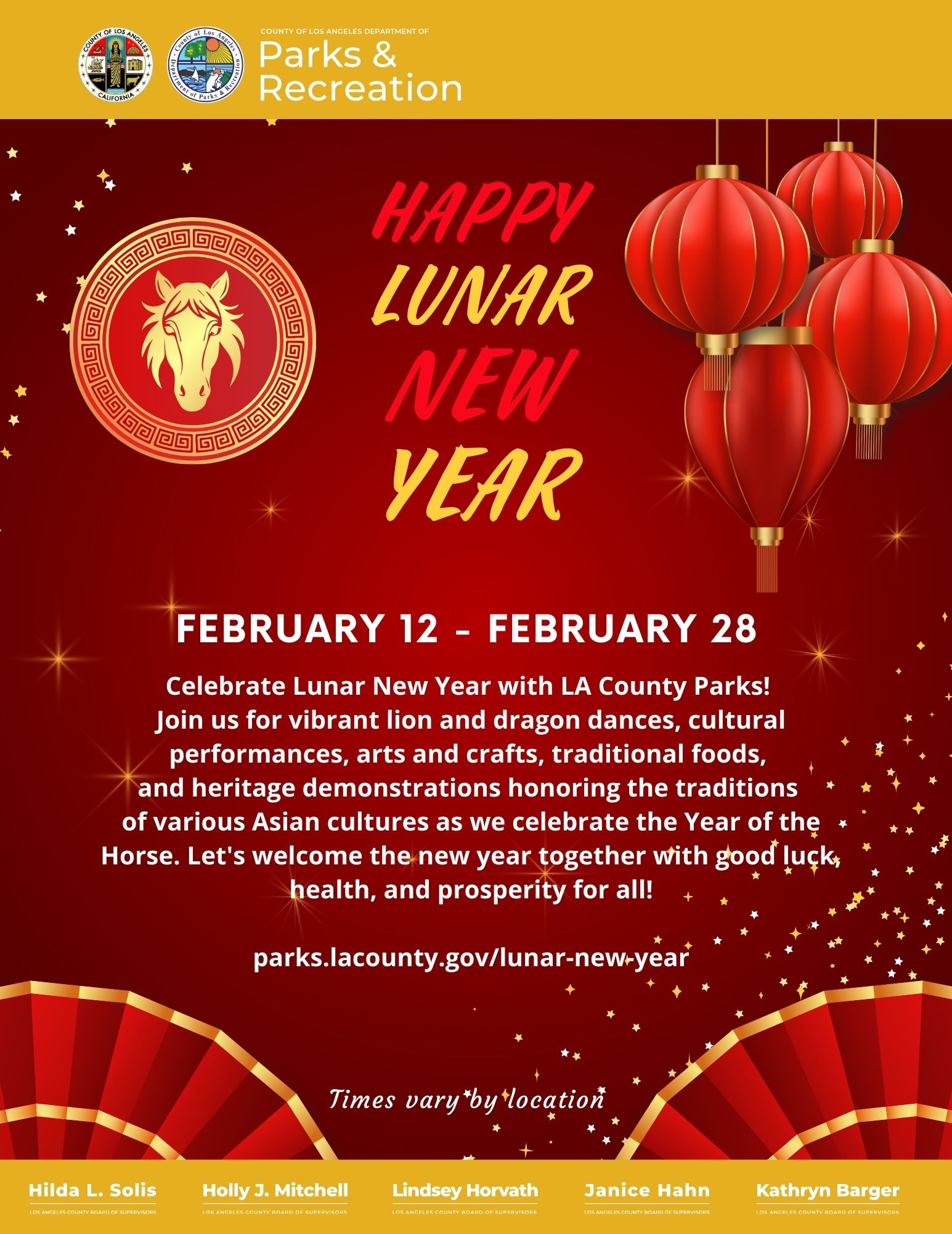 The County of Los Angeles Department of Parks and Recreation will host Lunar New Year 2026 celebrations from Feb. 12 through Feb. 28 at 59 parks throughout Los Angeles County.