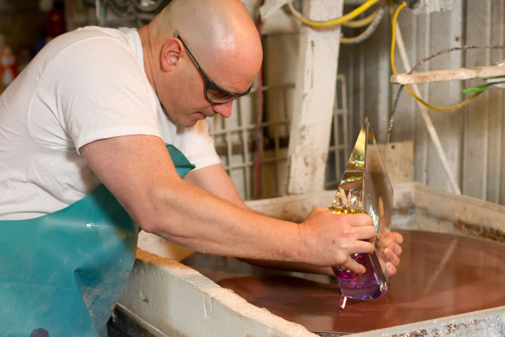 He combines pure, lead crystal and dichroic glass through a cold-glass production process. These beautifully reflective, hand-sculpted pieces begin with a core of dichroic glass pieces, each cut, polished and laminated until they shine like mirrors. This core is then wrapped in sculpted, optic glass which refracts the light passing through the pieces and creates a hypnotic light show of fire and ice colors, which are incredibly beautiful and coveted by all who lay eyes on them.