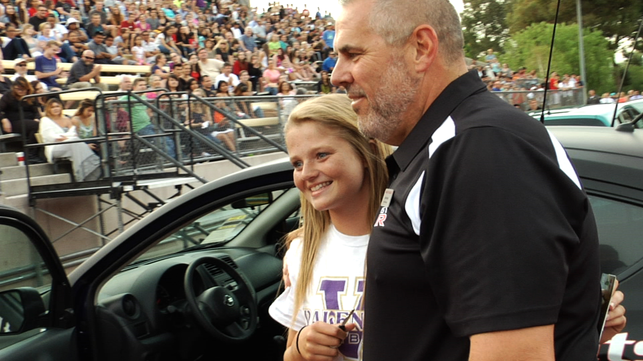 Dan Sterkel, general manager of Nissan of Valencia, gave away a Nissan Versa from his dealership to Taylor Morrison, a junior at Valencia who touts an impressive attendance record.