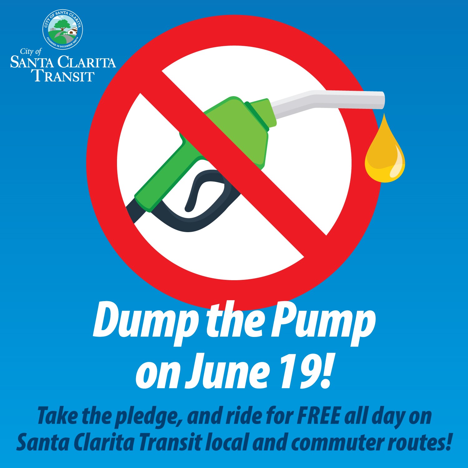Santa Clarita Transit encourages both new and returning riders to take advantage of this opportunity to experience the benefits of public transportation. For more information and to take the pledge, visit SantaClaritaTransit.com/Dump-the-Pump.
