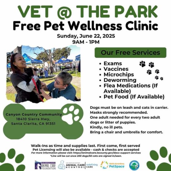 On Sunday, June 22, 9 a.m.-1 p.m. the Vet at the Park Mobile Clinic will visit Canyon Country Community Center, 18410 Sierra Highway, Santa Clarita, CA 91351.