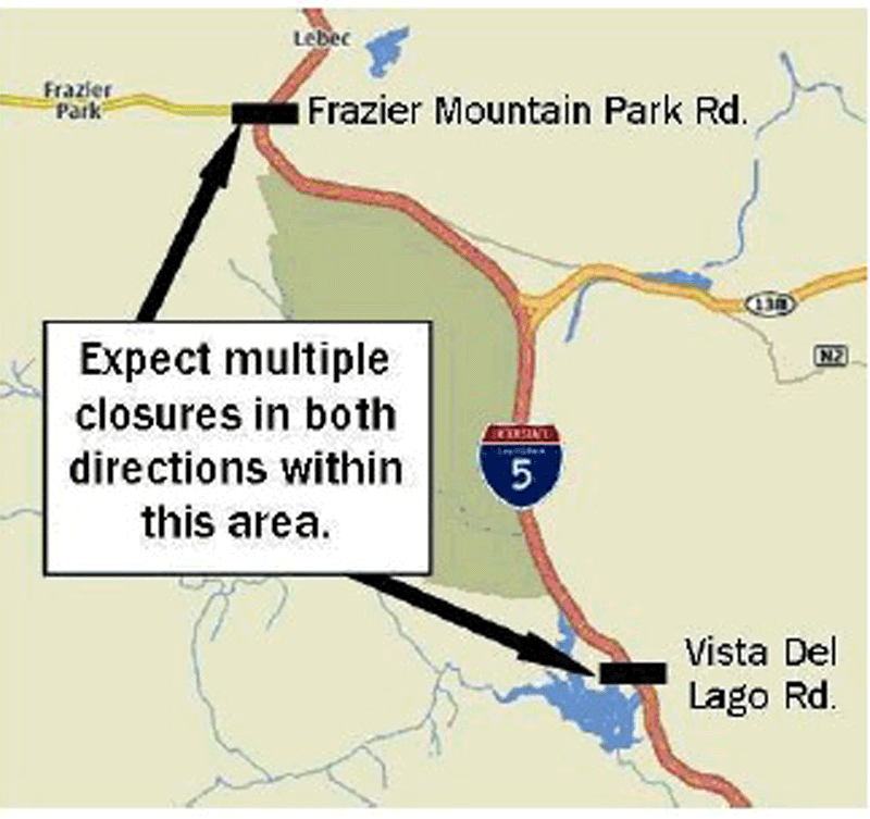 Northbound I-5 between Vista Del Lago Road and Frazier Mountain Park Road: One lane may be closed at any time; up to two lanes from 7 p.m. to noon.