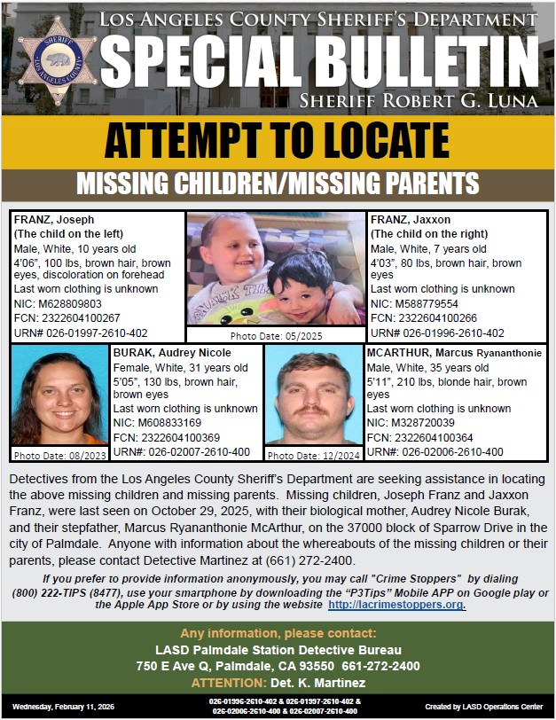 The children, Joseph and Jaxxon, were last seen on Oct. 29, 2025, with their biological mother, Audrey Nicole Burak, and their stepfather, Marcus Ryananthonie McArthur on the 37000 block of Sparrow Drive in the city of Palmdale.