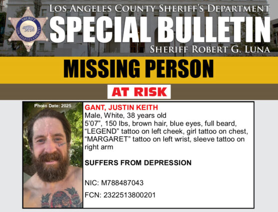 Los Angeles County Sheriff’s Department investigators are seeking the public’s assistance locating At-Risk Missing Person, Justin Keith Gant.