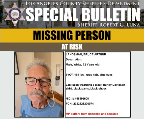 Los Angeles County Sheriff’s Department Missing Persons Unit investigators are asking for the public’s help locating At-Risk Missing Person Bruce Arthur Landsman.