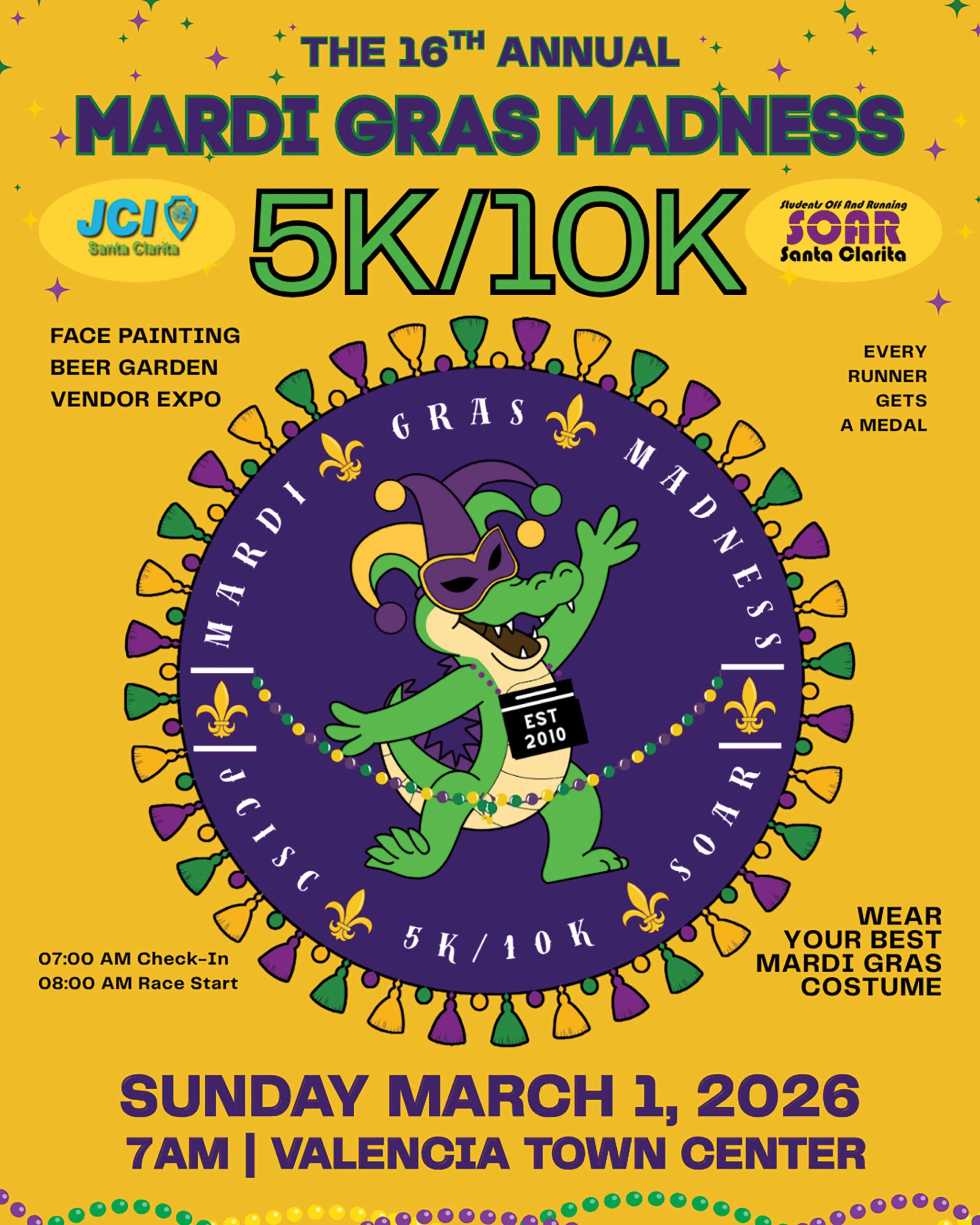 As an official featured charity of the 2026 ASICS Los Angeles Marathon, the Mardi Gras Madness 5K/10K extends its impact beyond race day. Proceeds will be split between SOAR, supporting youth through structured training and mentorship, and JCI Santa Clarita, funding ongoing and future community projects across the valley.