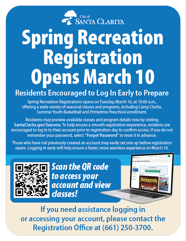 The city of Santa Clarita will open Spring Recreation Registration on Tuesday, March 10, at 10 a.m., offering a wide variety of seasonal classes and programs, including Camp Clarita, Summer Youth Basketball and Primetime Preschool enrollment.