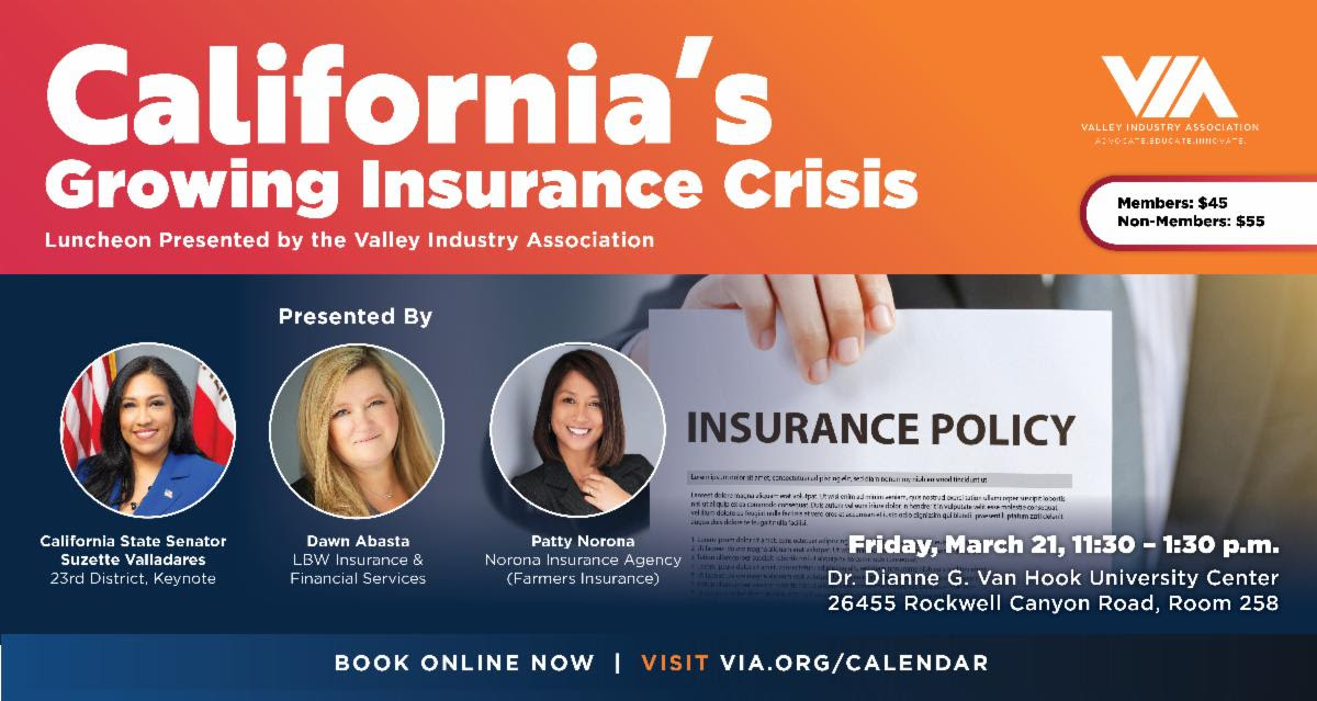 The Valley Industry Association will host a luncheon Friday, March 21, on the topic of “California’s Growing Insurance Crisis.”