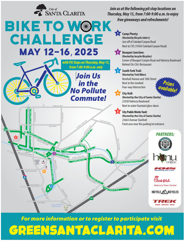 For questions about the Bike to Work Challenge, please contact Environmental Services at (661) 286-4098 or ENVIRONMENT@santa-clarita.com. We look forward to seeing you on the trails!