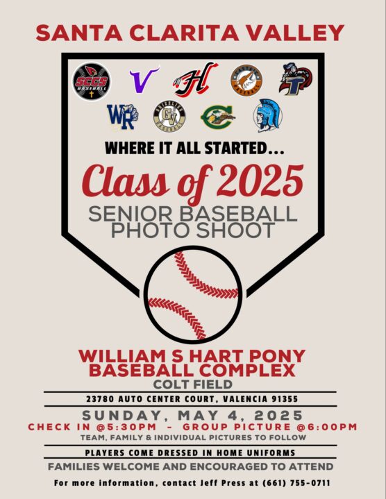 The William S Hart Pony Baseball Complex will be the site of a fun, nostalgic and free photo shoot on Sunday, May 4, beginning at 5:30 p.m. Local high school baseball players from the graduating class of 2025 are encouraged to attend in their high school home uniforms and pose for group photos.