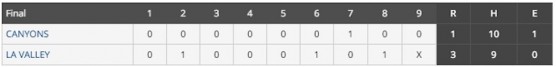 No. 3 College of the Canyons suffered a 3-1 conference loss to host No. 19 L.A. Valley College on Tuesday, with the hard-hitting Cougars held scoreless until the seventh inning.