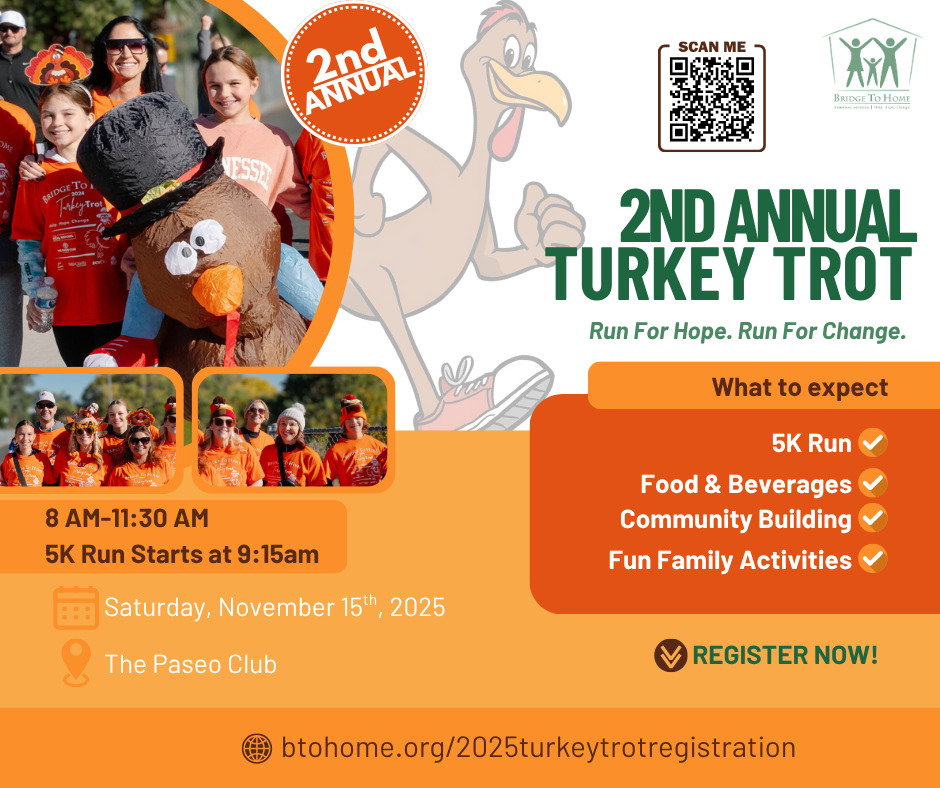 Bridge to Home is inviting the community to join the fun at the Second Annual Turkey Trot on Saturday, Nov. 15, at The Paseo Club in Valencia.