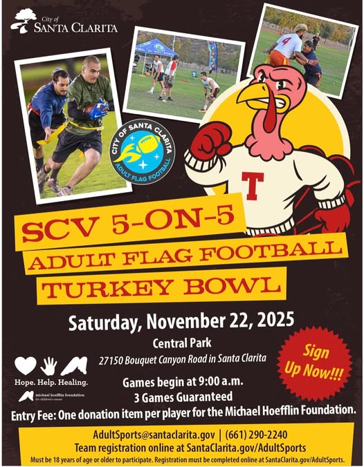 The city of Santa Clarita invites teams to sign up for the Santa Clarita Valley 5-on-5 Adult Flag Football Turkey Bowl.