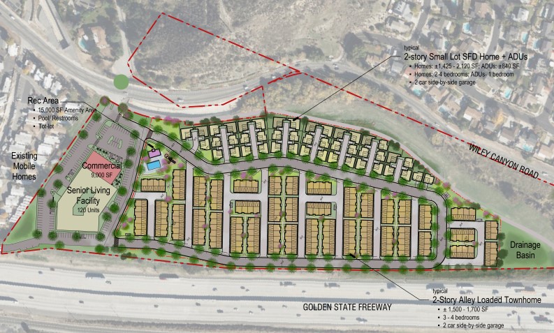 An appeal letter, signed by 30 members of the public, is contesting the approval of the project by the Santa Clarita Planning Commission to allow for the development of a mixed-use project consisting of a senior-living facility with 120 assisted-living units; 9,000 square feet of commercial floor area; 45 detached single-family units, 8 of which would include an attached Accessory Dwelling Unit and 179 townhome units.