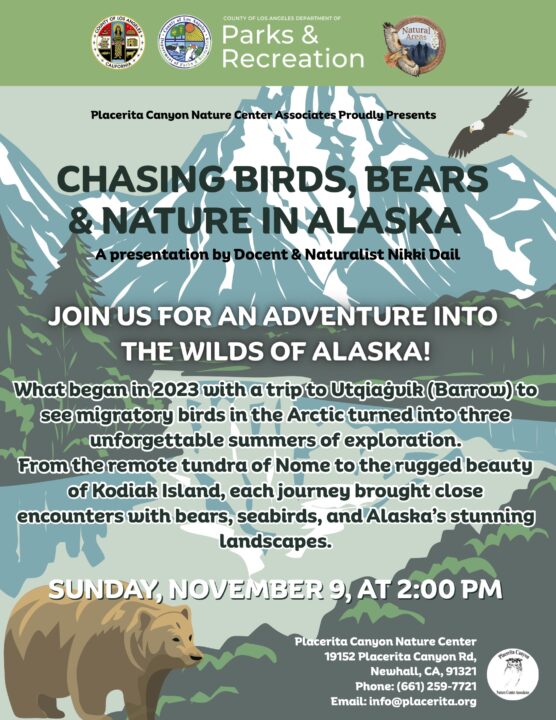 A community nature education event, Chasing Birds, Bears and Nature in Alaska, will be presented by docent and naturalist Nikki Dail at the Placerita Canyon Nature Center on Sunday, Nov. 9 at 2 p.m.