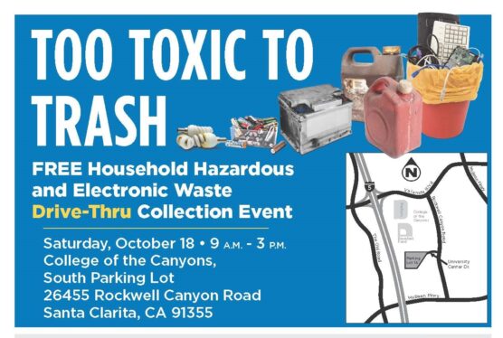 There will be a free household hazardous waste and e-waste recycling collection event for Santa Clarita area residents on Saturday, Oct. 18 at College of the Canyons, South Parking Lot, 26455 Rockwell Canyon Rd., in Santa Clarita from 9 a.m. to 3 p.m.