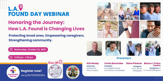 In recognition of the L.A. County Board of Supervisors’ motion proclaiming Wednesday, Oct. 15, as “L.A. Found Day,” the Aging & Disabilities Department invites the public to a special webinar, Honoring the Journey: How L.A. Found is Changing Lives.