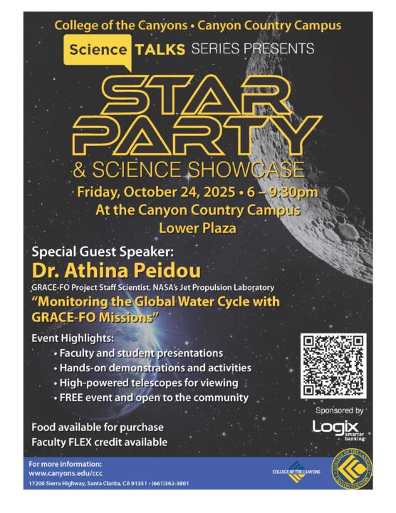 College of the Canyons will host its Fall 2025 Star Party on Friday, Oct. 24, featuring a keynote presentation by Dr. Athina Peidou, a geodesist and GRACE-FO Project Staff Scientist at NASA’s Jet Propulsion Laboratory.