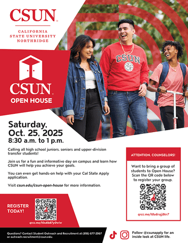 California State University, Northridge is opening its doors to local high school and community college students on Saturday, Oct. 25, from 8:30 a.m. to 1 p.m., for an all-access look at the campus, its academic programs and student support services.