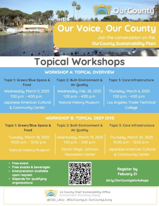As we look towards rebuilding from the recent fire devastation, it is more important than ever to consider what a more sustainable and resilient LA County should look like. The Chief Sustainability Office is working on updating the OurCounty Sustainability Plan, which was first released in 2019. The Plan serves as a long-range strategy to build a healthier, more equitable, resilient, and economically strong region where everyone thrives, and  your input is needed on the 2025 update.
