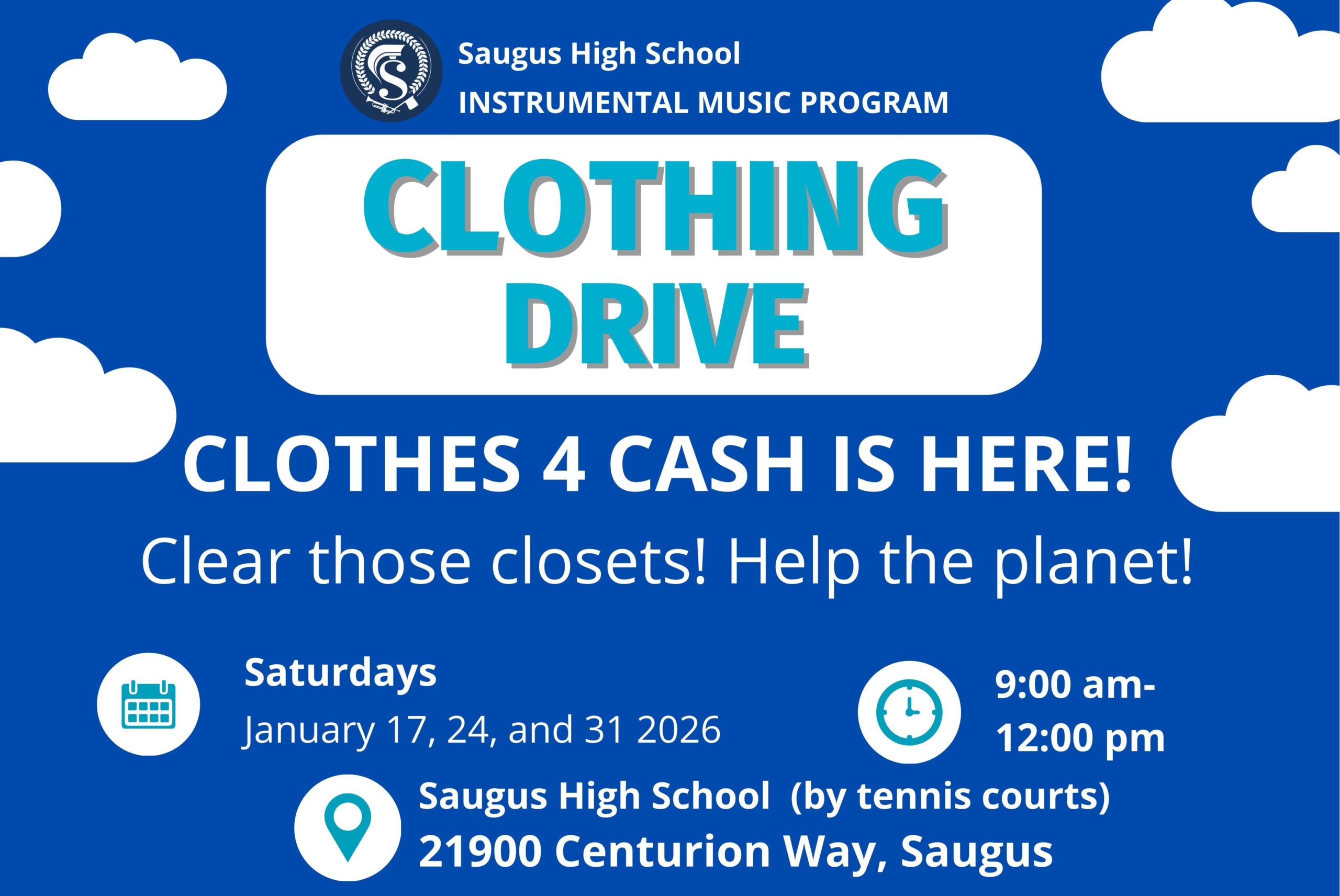 Clothes for Cash will be held Saturdays, 8 a.m.-11 a.m. on Jan. 17, Jan. 24 and Jan. 31 at 21900 Centurion Way, Santa Clarita, CA 91350. Southwest corner of the Saugus High School Parking lot, near the Marching Centurions trailers and the tennis courts. Look for the E-Z-Ups.
