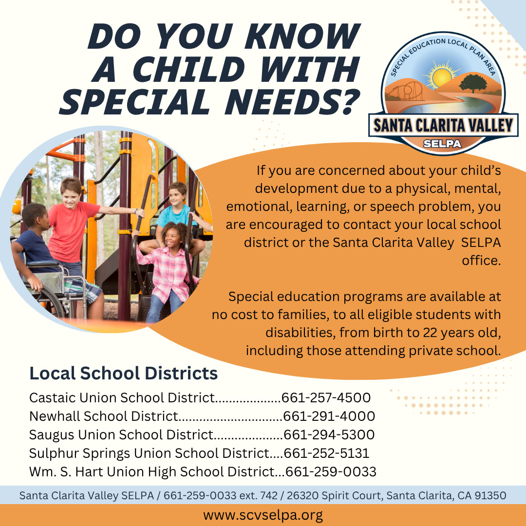 Do you know a child with special needs? The Santa Clarita Valley Special Education Local Plan Area and its member school districts actively seek out all individuals with exceptional needs, from birth to age 22, including infants and children attending private schools.