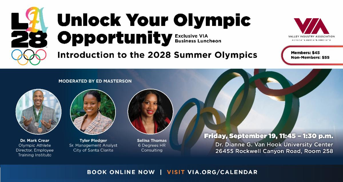 The Valley Industry Association will host “Unlock Your Olympic Opportunity,” a VIA business luncheon and an introduction to the 2028 Summer Olympics on Friday, Sept. 19, 11:45 a.m.-1:30 p.m.