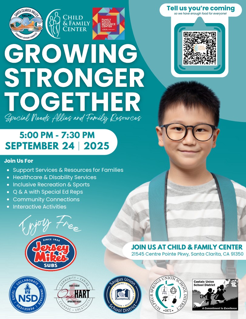Child & Family Center in partnership with Santa Clarita Valley SELPA invites everyone to the 2025 Growing Stronger Together Family Resource Fair.