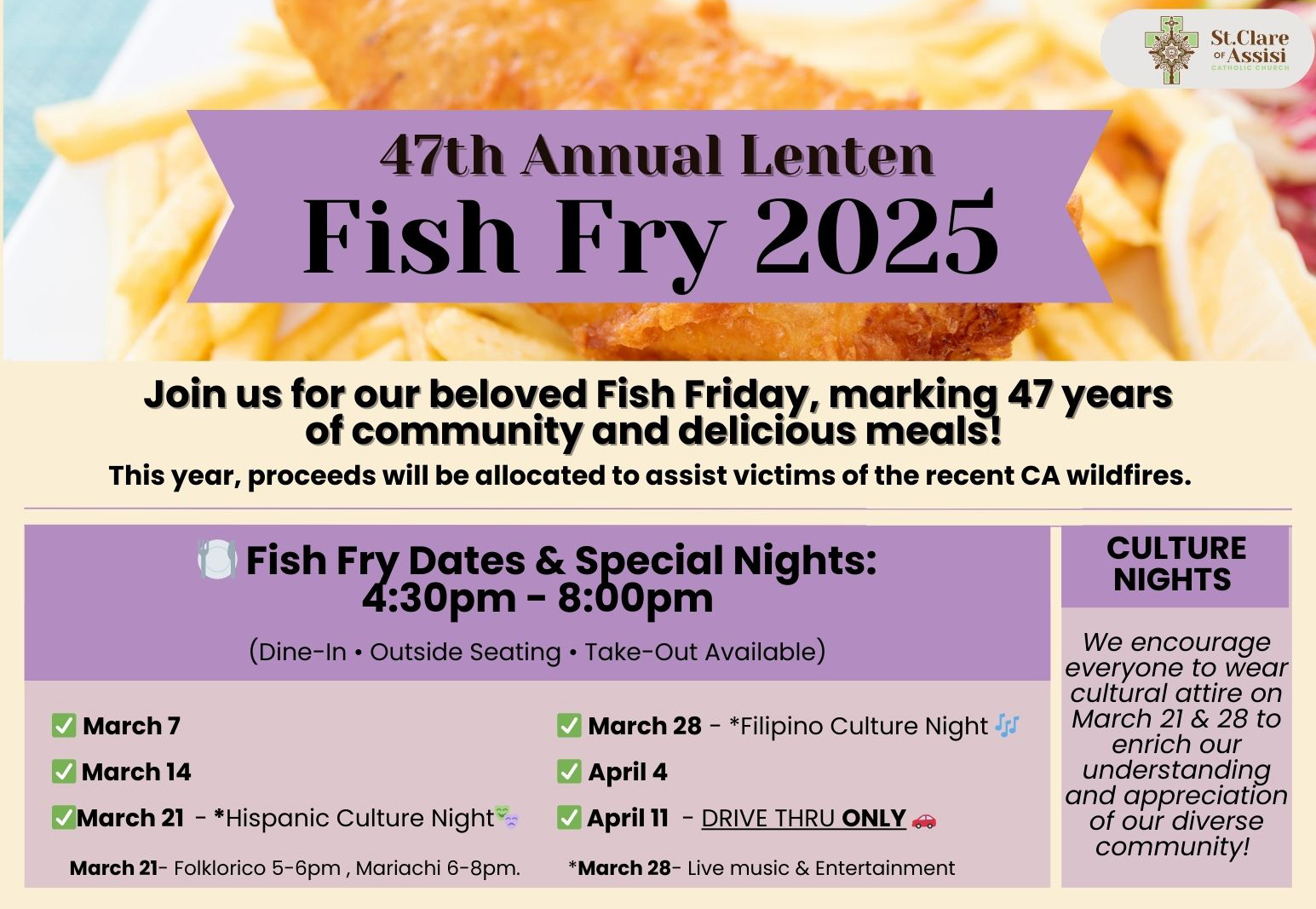 The 47th Annual St. Clare of Assisi Catholic Church Lenten Fish Fry opened for the season on Friday, March 7, and sold out within hours. It will continue every Friday through April 11. The Lenten Fish Fry hours are 4 p.m.-8 p.m., but sold out before 7 p.m. on the first weekend.